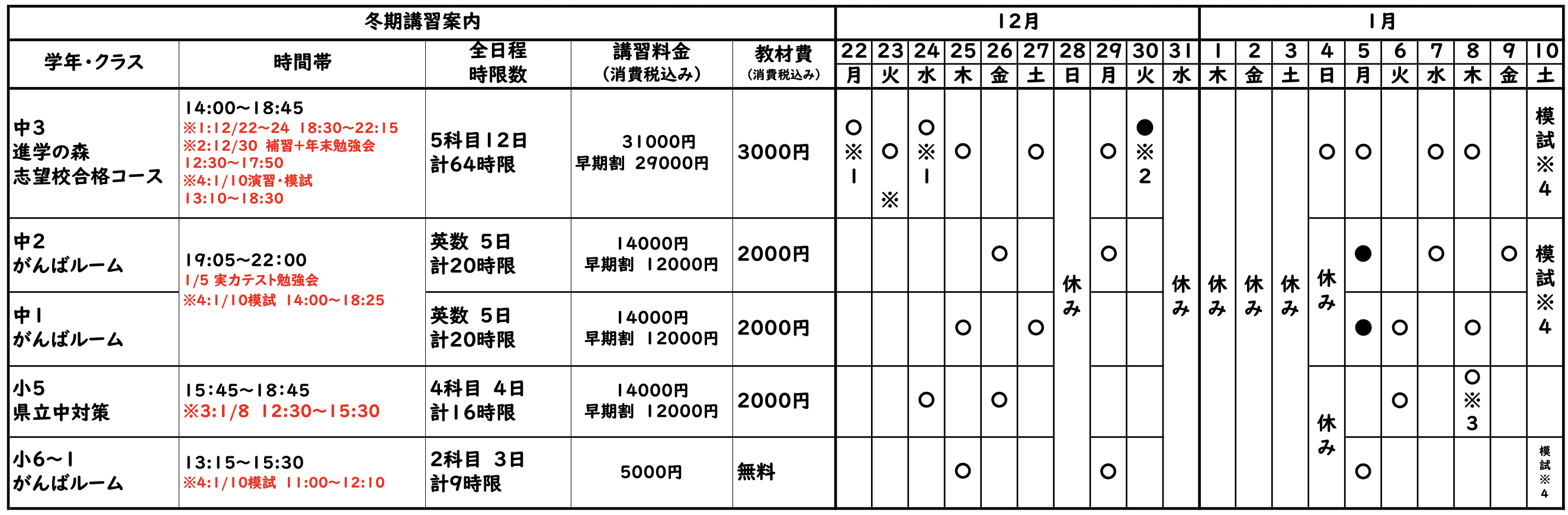 ※2 中3 12/30は「年末勉強会」(【中3】12:30~17:50)を設けます。冬期テキスト内容のチェックテスト、質問対応を行います。中3は1コマ目で補習授業を実施。